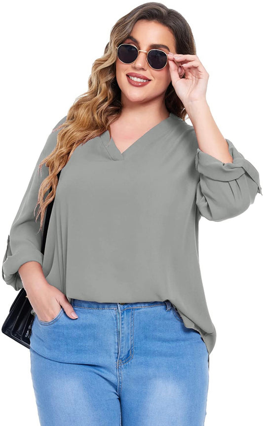 Blouse Roll-Up Long Sleeve Tops V Neck Casual Shirts