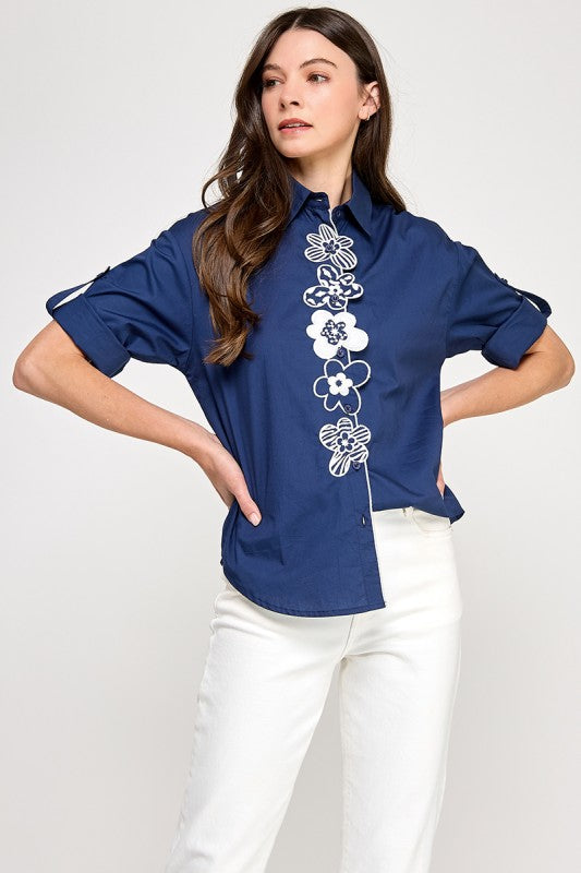 Navy Flower Embroidery Shirt