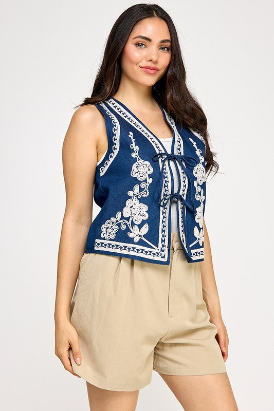 Dark Denim Embroidery Detail Denim Vest